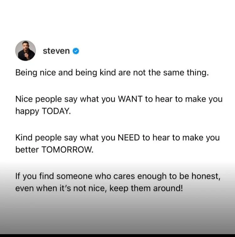 I saw this above written by Steven Bartlett some months ago which resonated with me. While being considerate and kind is valuable, solely relying on niceness as a defining trait can be misleading and even harmful. I agree with the distinction between being nice and being kind, and it is important shedding light on the absurdity of prioritising niceness at the expense of authenticity.
